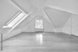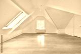 an empty room with wood floors and skylights in the corners on the right side of the room, there is a window