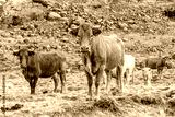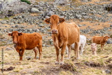 Cows and calf in the meadows of the Gredos Platform, Sierra de Gredos, Ávila, Spain.