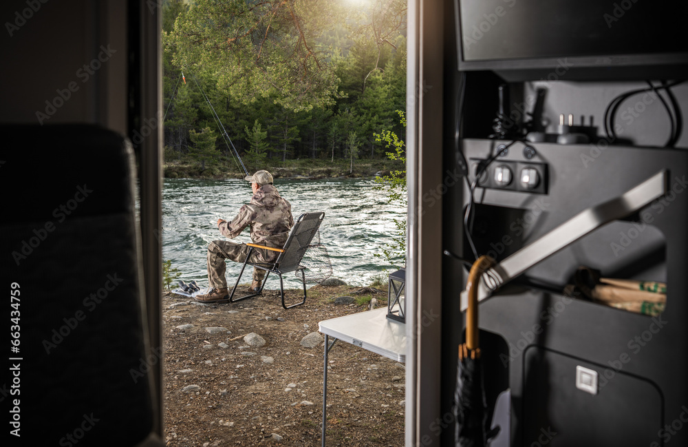 Relaxed Man Fly Fishing in Front of His RV Motor Home.