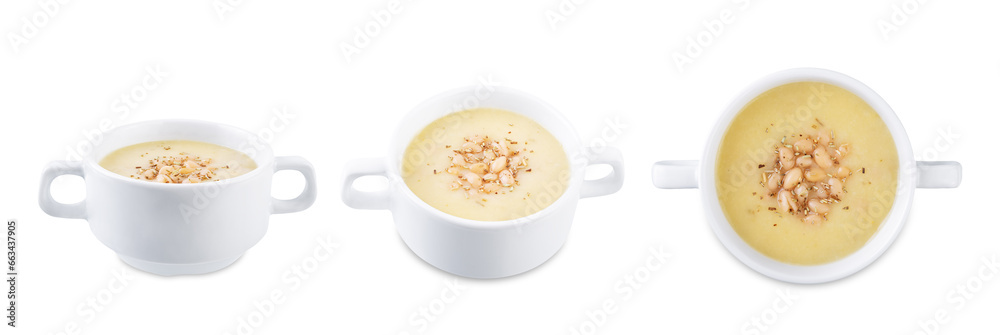 White beans rosemary potato soup in a bowl on a white isolated background