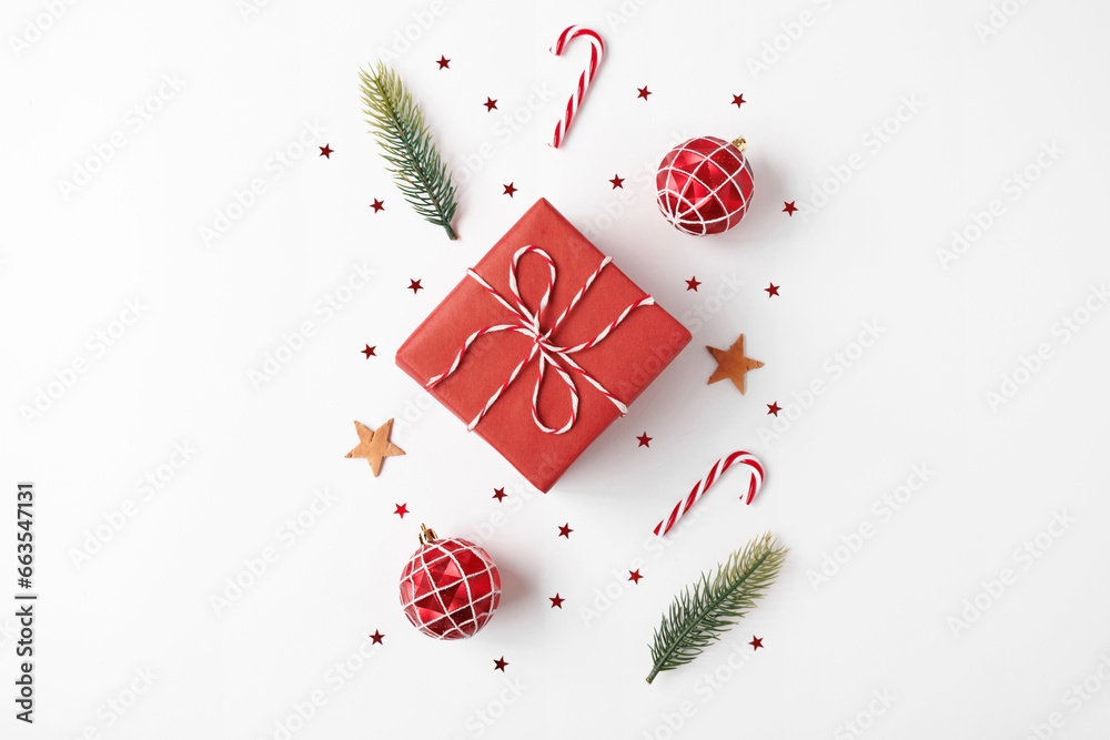 Christmas gift with decorations on white background