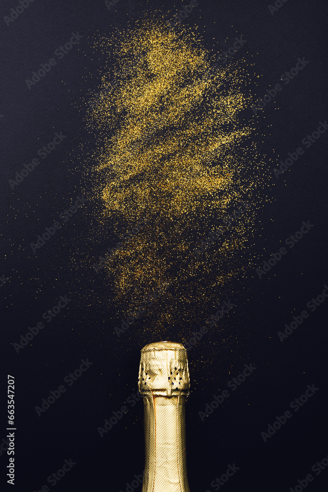 Champagne bottle with glitter on black background