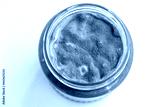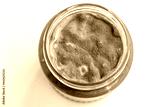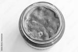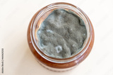 Open jar with sweet jam and mold on a white background. Mold in a jar of raspberry jam. Hazardous to health.