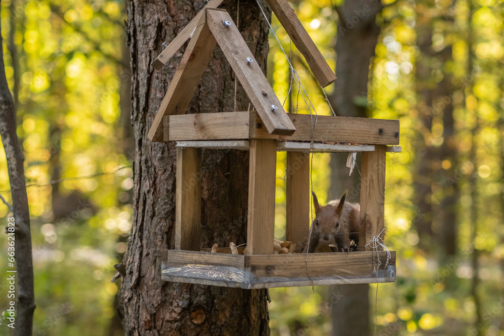 A beautiful red squirrel climbs a tree in search of food. A squirrel sits in a feeder eating nuts and seeds close-up.