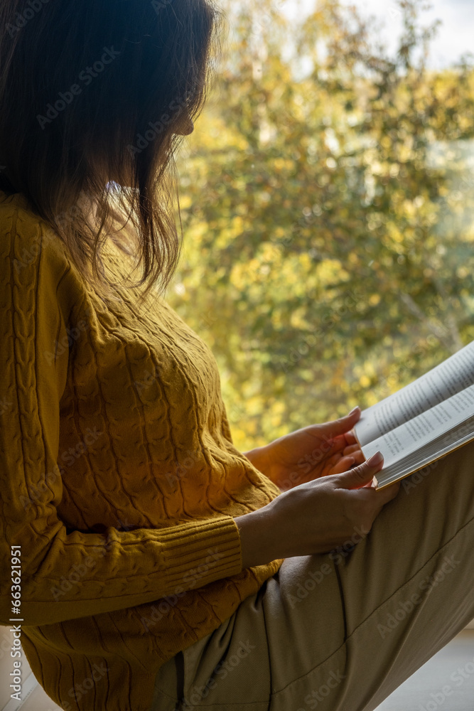 Young beautiful woman sitting by the window yellow knitted sweater read book, daily planner, notepad. Relax concept. Hold cappuccino glass of coffee with white foam. Text is out of focus