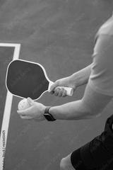 Close up abstract photo of a man holding a pickleball racket and a pickle ball ready to serve in on a pickleball court