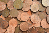 1 cent euro coins, 2 cent euro coins and 5 cent euro coins. Pile of euro cent coins.