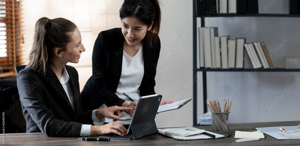 Two businesswoman in suit working together on digital tablet. Creative female executives discussing in an office.