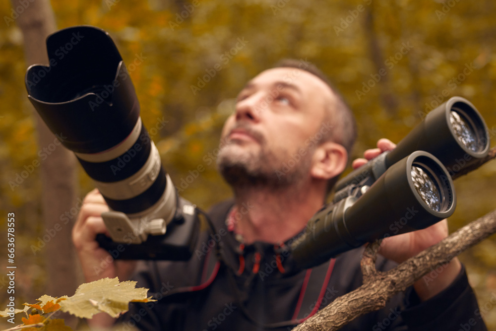 Man using binoculars and camera for birdwatching and other observing animals in nature.