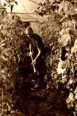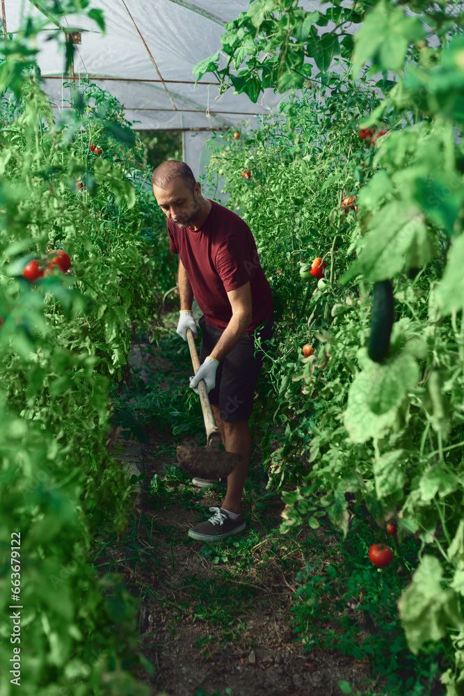 Farmer taking care of organic tomatoes in a small greenhouse.