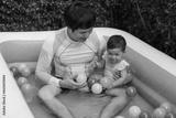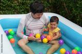 happy father and infant baby girl playing water with colorful plastic balls in inflatable pool