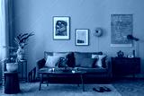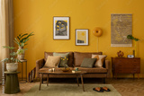Warm and cozy composition of vintage living room interior with mock up poster frame, cilime, brown sofa, wooden sideboard, coffee table, slippers, plants, green rug. Home decor. Template.