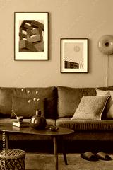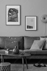 Interior design of yellow living room interior with mock up poster frame, brown sofa, wooden coffee table, slippers, green rug, basket, orange lamp and personal accessories. Home decor. Template.