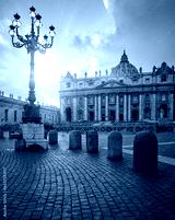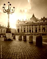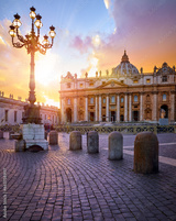 Vatican City Holy( See. Rome, Italy. Dome of St. Peters Basil cathedral at Saint Square. Evening sunset, golden hour with evening sky and street lamps