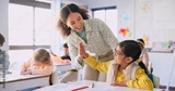 Teacher woman, high five girl and classroom with achievement, success and mentorship for learning. Education, development and students with goals, knowledge and books with celebration at school desk