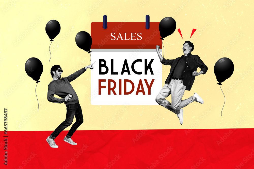 Image sketch collage black friday day soon two funny guys celebrating sales holiday calendar shopping today isolated on yellow background