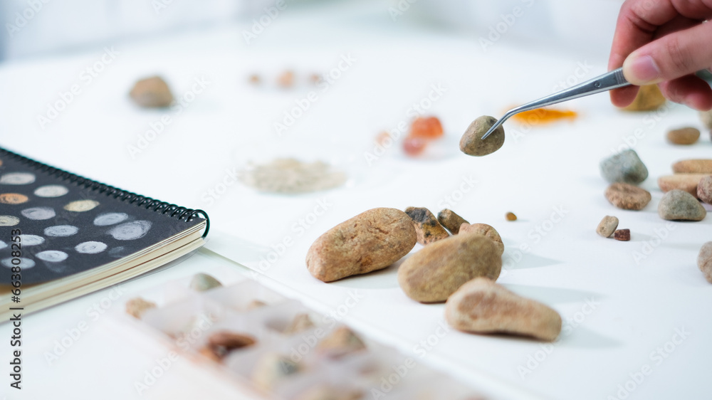 Close up of geologist or archaeologist is picking up an sample of rock or mineral in paleontology, archaeological and geological or mining laboratory. Concept of fossil research or soil experiment.