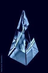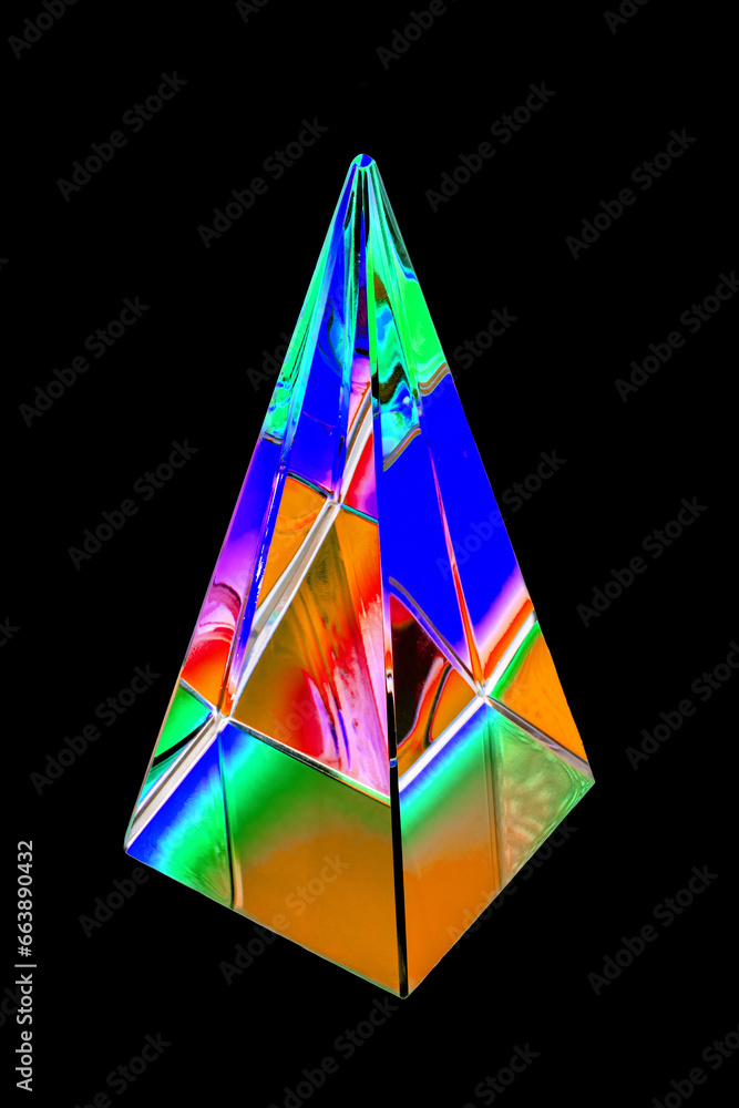 Glass pyramid prism with colorful light reflection on black background with copy space