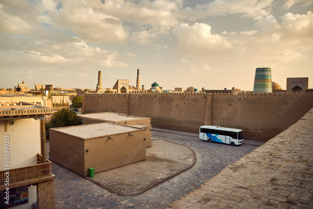 Tourist Bus in ancient city at Khiva in Uzbekistan
