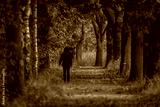 Leaf tree alley in autumn color morning near Vrbenske ponds with tourist woman