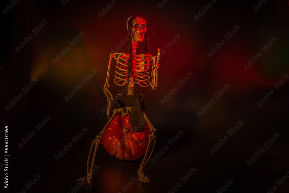 View of skeleton sitting on pumpkin for Halloween with orange backlight on black background. Sweden.