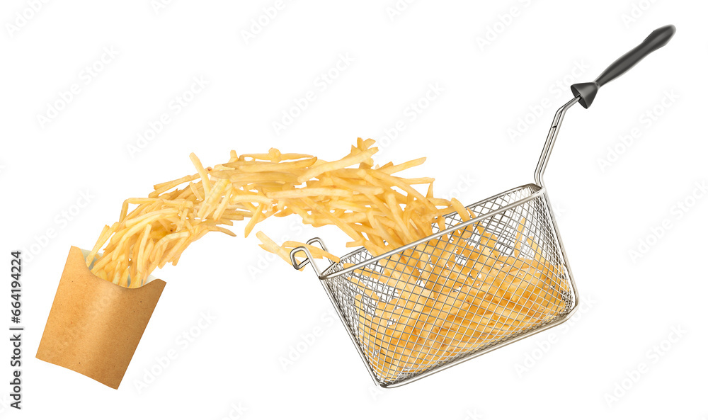 French fries flying out of the fryer into a french fry package on a white isolated background