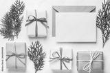 Christmas gift craft boxes, craft paper envelope and blank card and thuja branches. Christmas or holiday card. Boxing Day.