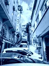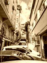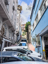 Istanbul, Turkey - October 6, 2023: Narrow streets of Beyoglu district in Istanbul filled with cars. The atmosphere of the old city.