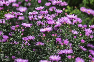 Purple flowers of perennial aster. Autumn asters. Bright colored autumn.Selective focus.