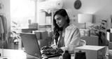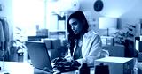 Designer, woman and typing email on laptop in office for research, feedback and supply chain for business. Indian, person or planning on pc for logistics, stock administration or package distribution
