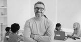 Portrait, man and teacher with arms crossed, classroom and education with children, students and employee. Face, happy person and educator with kids, learning and teaching in a school and knowledge