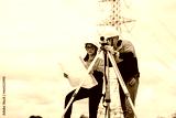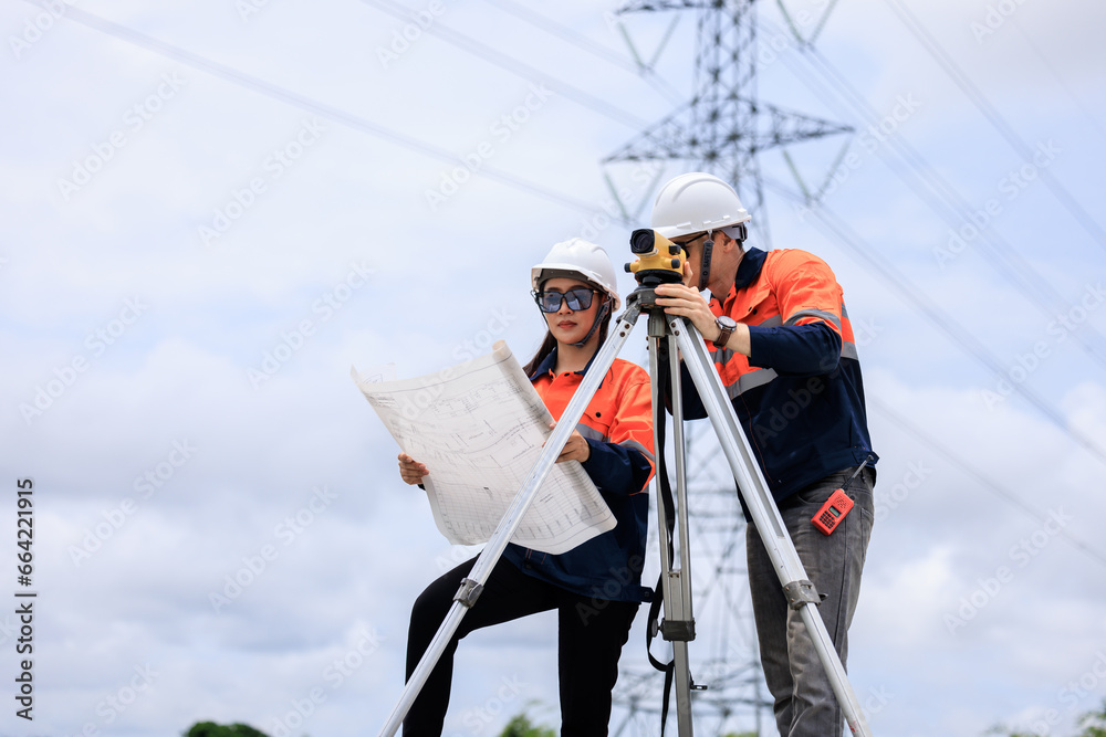 Engineer use theodolite equipment and Blueprint surveying construction worker on Railway site..
