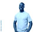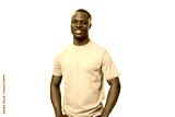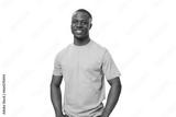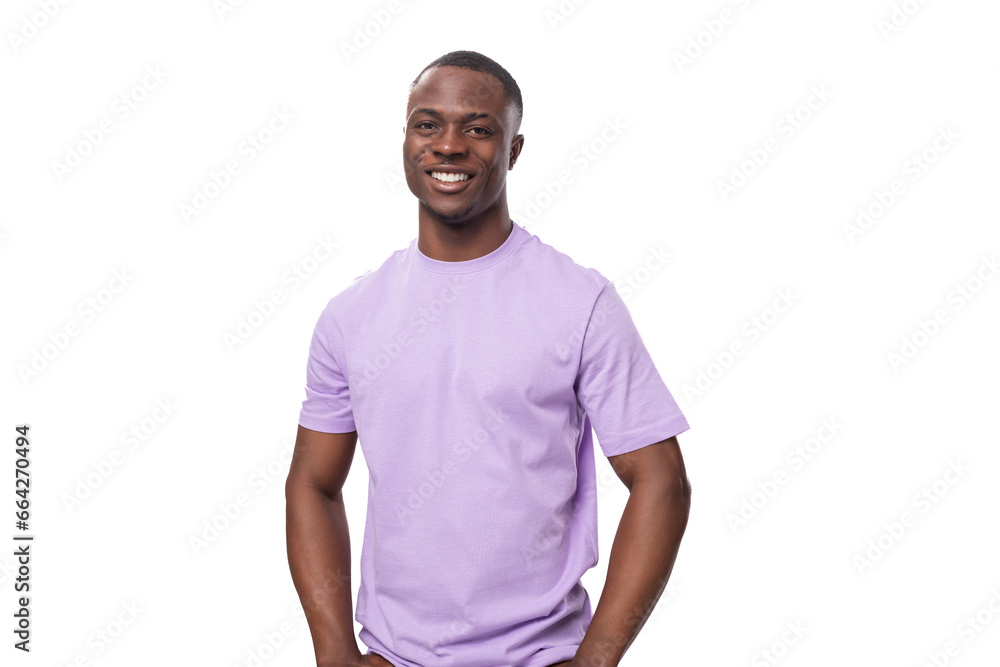 young shy handsome american man dressed in a light lilac basic t-shirt on a white background with copy space