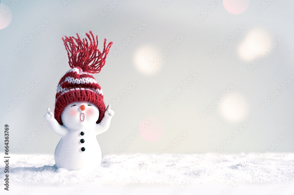 One little snowman in caps on snow in the winter. Background with a funny snowman. Christmas card.