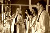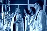 A group of doctors discusses the diagnosis of X-rays in the office. Fracture of the leg and hip joint. In the background, an Arabian professor explains to students physicians anatomy