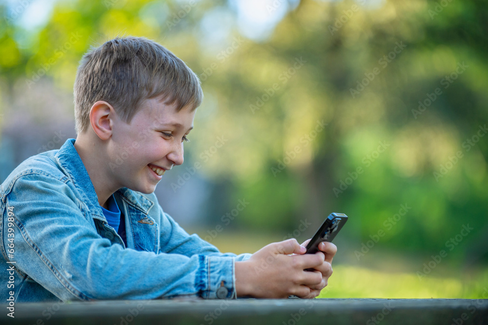 Young cheerful teen typing on mobile phone sitting behind a table in a park. Smiling child is texting on the phone in a garden, on a sunny summer day. Happy young boy playing on a cell phone outdoors.
