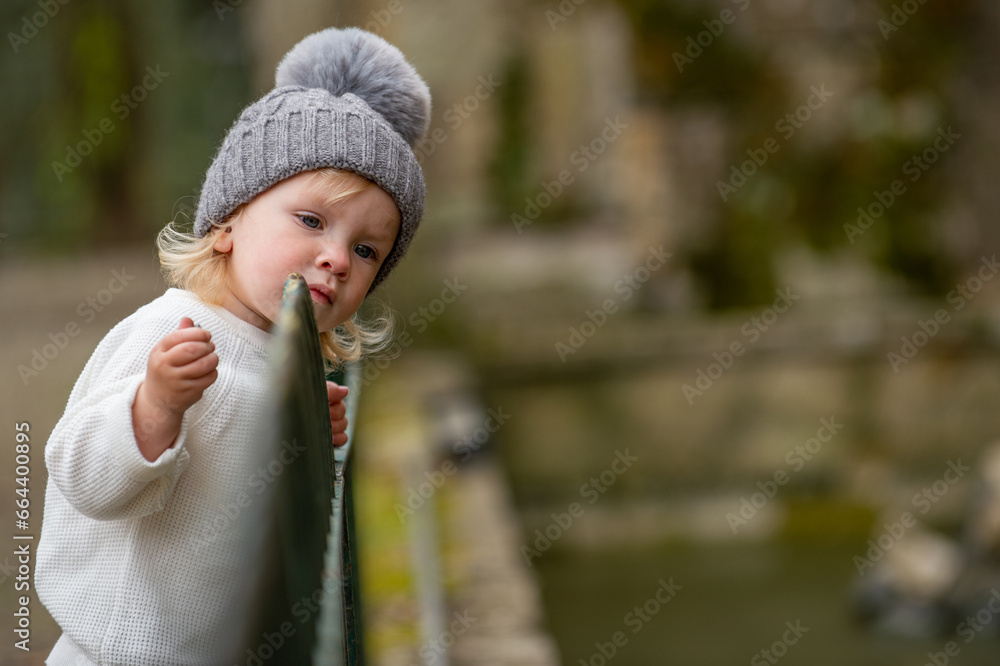 Cute blonde kid in a gray hat exploring the world around him in a park. Adorable caucasian child trying to look over a fence with curiosity on a chilly spring day.