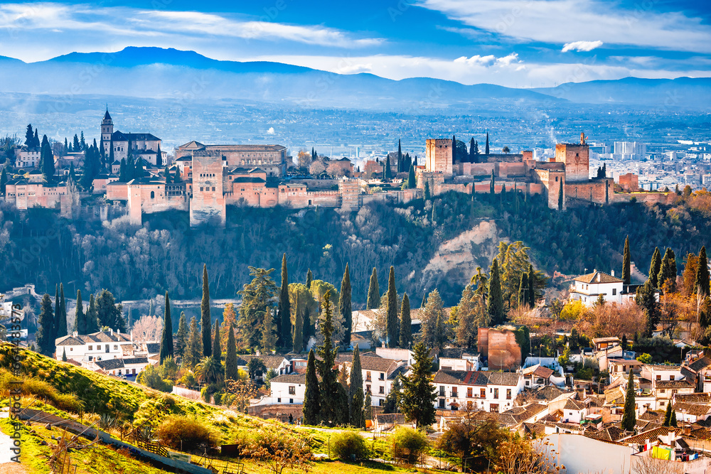 Ancient Alhambra and Sierra Nevada mountain view, UNESCO world heritage site in Granada