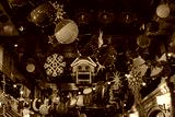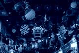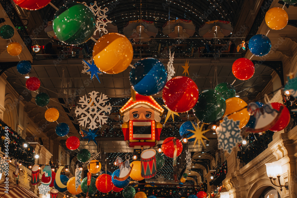 Nutcracker, winter snowflakes and garlans hanging in the historic russian shopping mall GUM. Christmas fairy tale in Moscow city