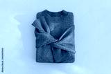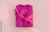 Magenta sweater on pale pink background. Women's jumper stylish autumn or winter clothes. Fashion outfit in fuchsia color. Cozy bright fall look. Flat lay, top view.