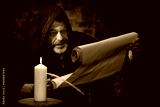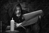 Emotional portrait of an elderly monk, by candlelight reading a message on parchment.