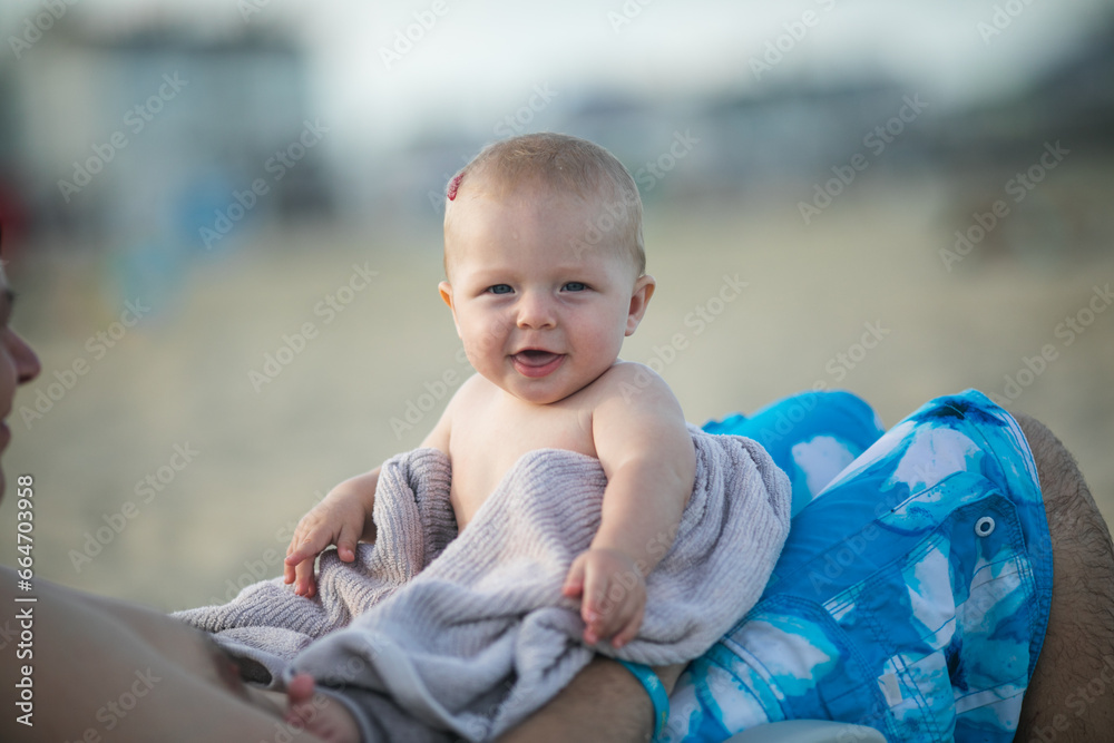 father holding his beautiful baby son in the beach with sunset light. Happy baby on ocean beach.