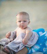 father holding his beautiful baby son in the beach with sunset light. Happy baby on ocean beach.