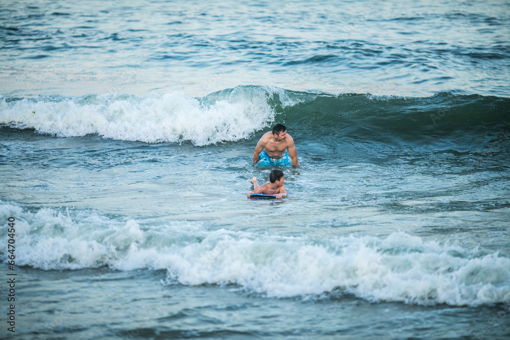 Little surfer learn to ride on surfboard on sea wave. Father with son play in summer ocean, learning surfing. Little boy swim on surf board
