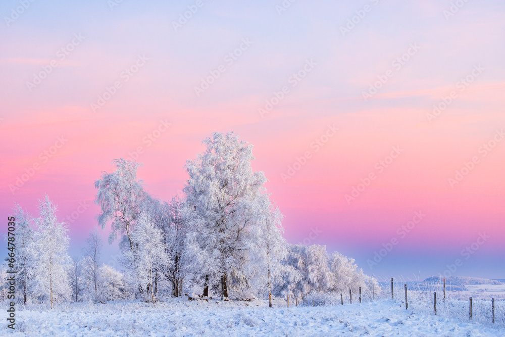 Hoarfrost on the trees in a winter landscape at dusk