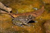 A beautiful Natal Cascade Frog (Hadromophryne natalensis) at the base of a waterfall in a forest
