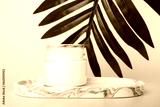Candle on a marble stand with a green leaf, Aromatic spa decor, coconut wax