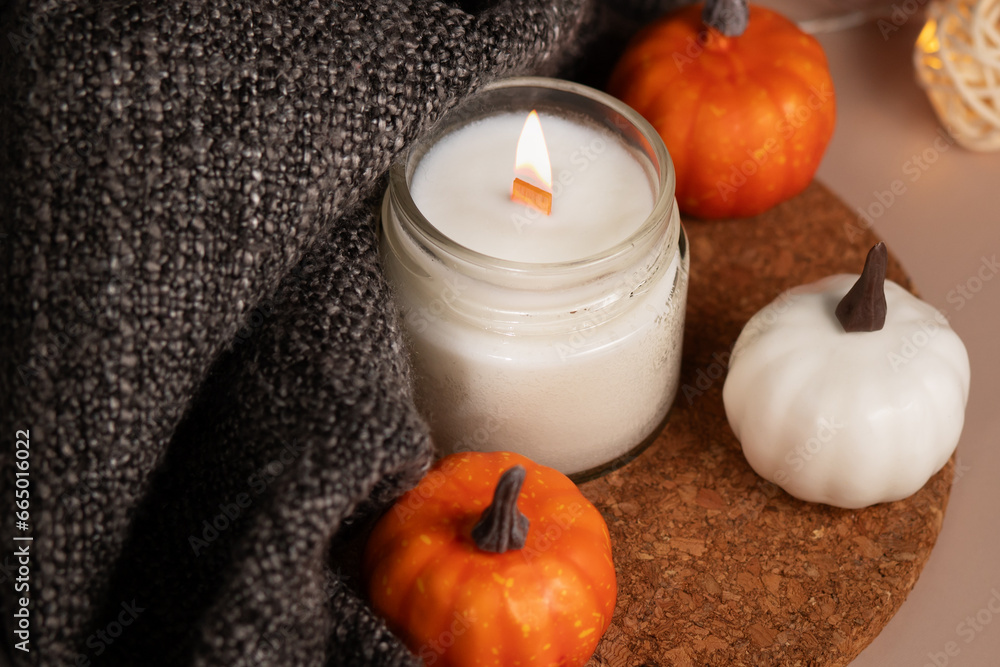Aromatic handmade candle and warm blanket and autumn pumpkins, Aroma therapy in the comfort of home