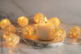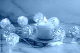 Aromatic burning candle on marble tray with warm lights, cozy minimalist design, Body care and relaxation in bathroom, home spa