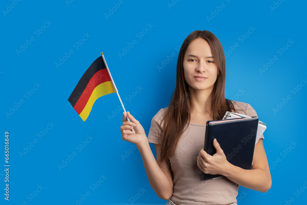 student with german flag on blue background, language learning, immigration, foreign education, work abroad, copy space